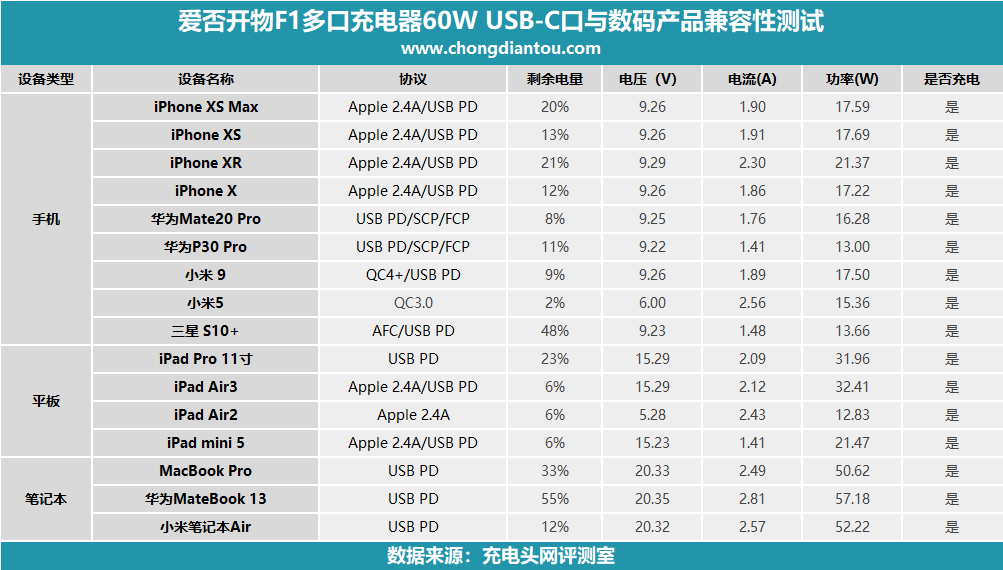 小編把以上測試數據做成了表格,方便大家觀看。愛否開物F1多口充電器的60W USB-C口兼容性很不錯,均能給所測試的設備開啟相對應最佳協議充電。另外,得益于該口支持20V 60W PD輸出,充筆記本電腦也不在話下。