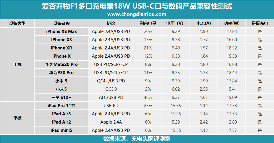 愛否開物F1多口充電器18W USB-C口的兼容性很不錯,均能為所測試設備開啟對應最佳協議充電。