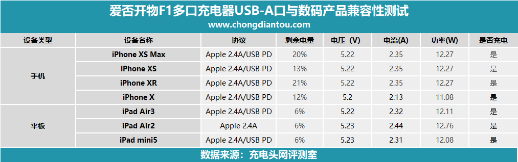愛否開物F1多口充電器USB-A口支持Apple 2.4A協議,比較適合給蘋果手機、平板等設備充電,兼容性也很不錯,實測均能為測試設備開啟Apple 2.4A協議充電。