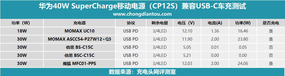 魔狐(MFC01-PPS)車充USB-C口充華為40W SCP移動電源,電壓12.03V,電流2A,功率24.17W。