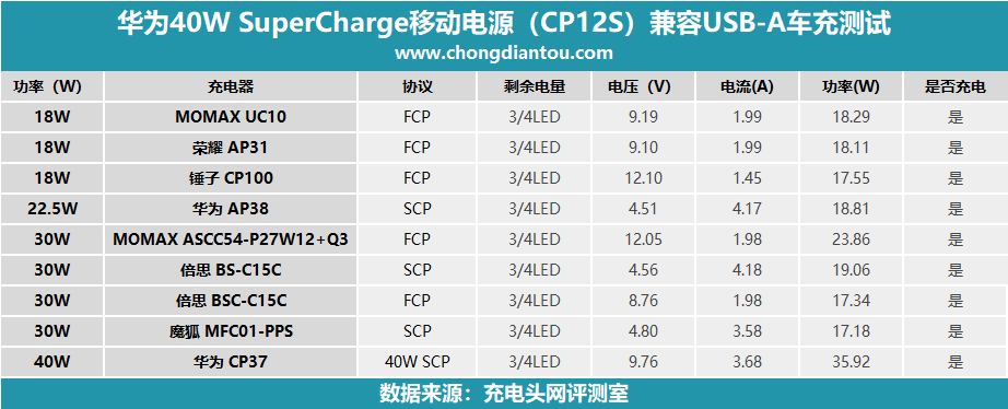 華為(CP37)車充USB-A口充華為40W SCP移動電源,電壓9.76V,電流3.68A,功率35.95W,開啟40W SCP快充。