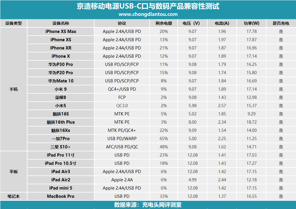 京造移動電源USB-C口支持Apple 2.4A協(xié)議以及PD、QC 2.0、QC 3.0、FCP、AFC、PE快充協(xié)議,整體測試下來兼容性不錯,除了自身兼容性不太好的魅族16S之外,均能和設(shè)備握手相對應(yīng)快充、協(xié)議。因為支持通用性廣泛的PD快充,像兼容性比較好的筆記本MacBook Pro它也充。