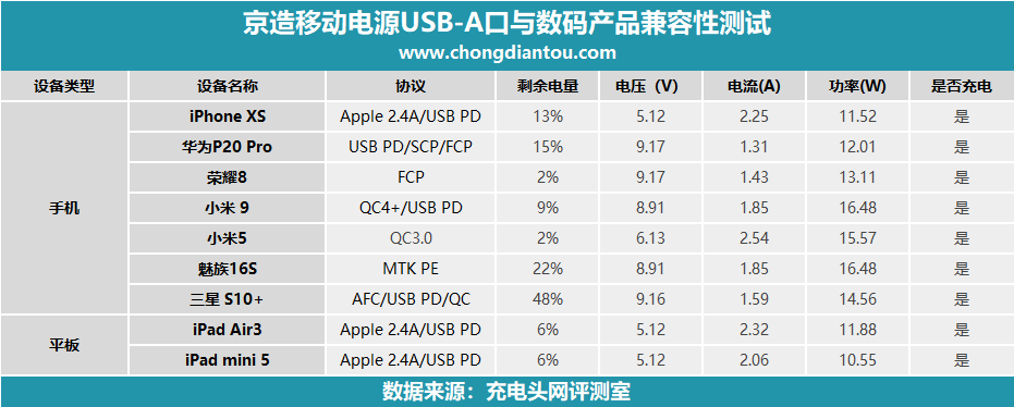 京造移動電源USB-A口支持Apple 2.4A協(xié)議以及QC 2.0、QC 3.0、FCP、AFC、PE快充協(xié)議,測試下來兼容性都不錯,在使用USB-C口充電不能進入快充的魅族16S也開啟了PE快充,如果你是魅族16S用戶,用此款移動電源的USB-A口給它充電將會有不錯的速度體驗。