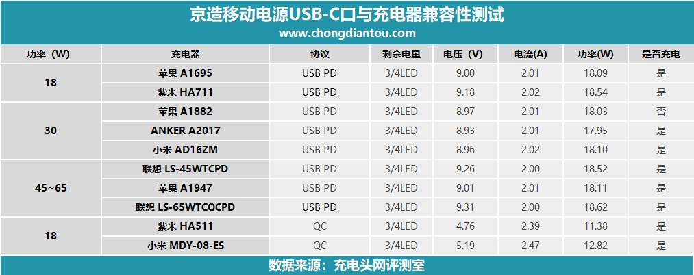 下面我們來看下京造移動電源的輸入兼容性情況。京造移動電源有USB-C、Micro USB兩個輸入接口,其中Micro USB最大功率10W,所以小編將只測試USB-C口的兼容性情況。