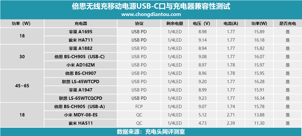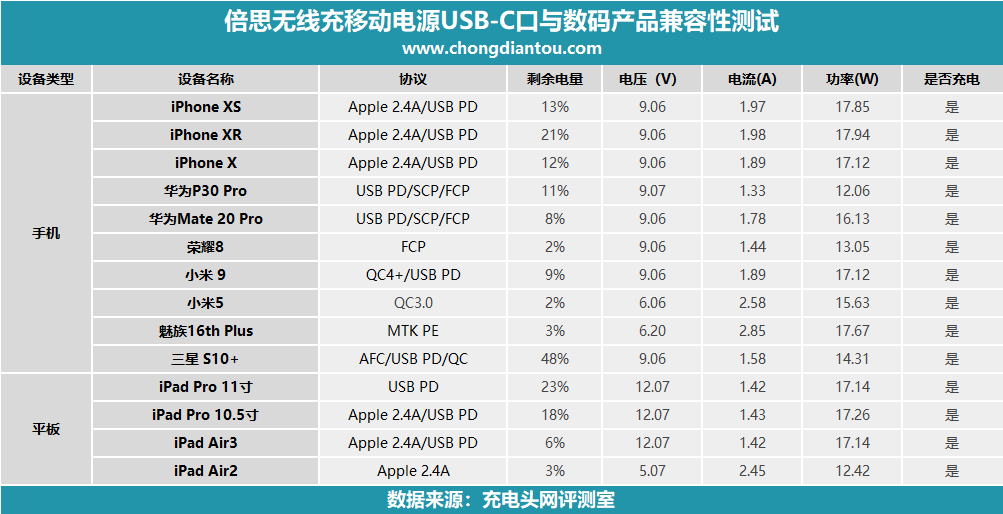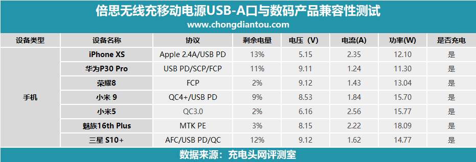 倍思無線充移動電源USB-C口支持Apple 2.4A、DCP協議,PD、QC 2.0、QC 3.0、AFC、FCP快充協議,在輸出兼容性測試環節,沒有出現拒充或者快充協議握手失敗的情況,兼容性變現十分不錯。