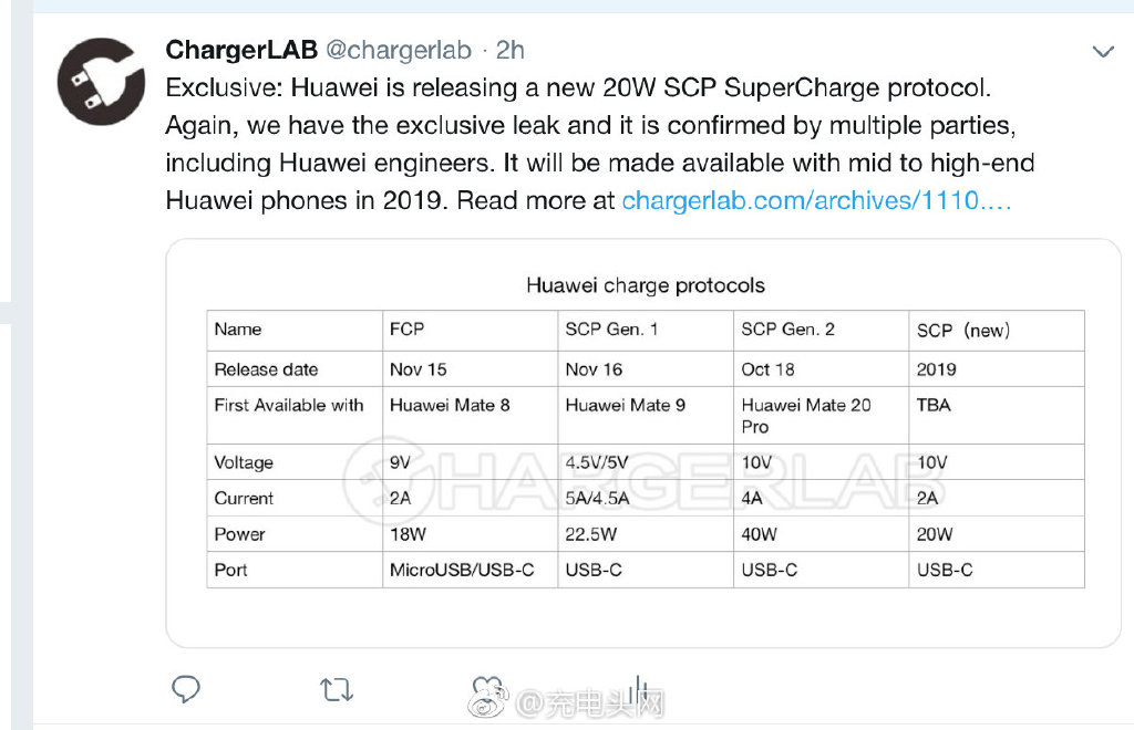 ChargerLAB表示:華為10V/2A電荷泵快充技術功率相比40W超級快充而言減小了一半,但是保留了黑科技“電荷泵”技術,成本更加親民,可以讓更多用戶享受到這一技術優勢,搭載這項技術的產品將于2019年面市。