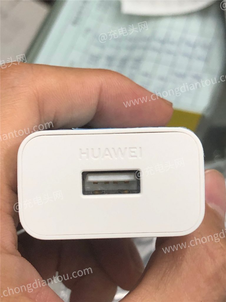 充電器輸出接口為USB-A,白色舌片,輸出端面印有華為標識:HUAWEI。從圖片上看輸出口觸點似乎與普通USB-A口沒有太大區別。