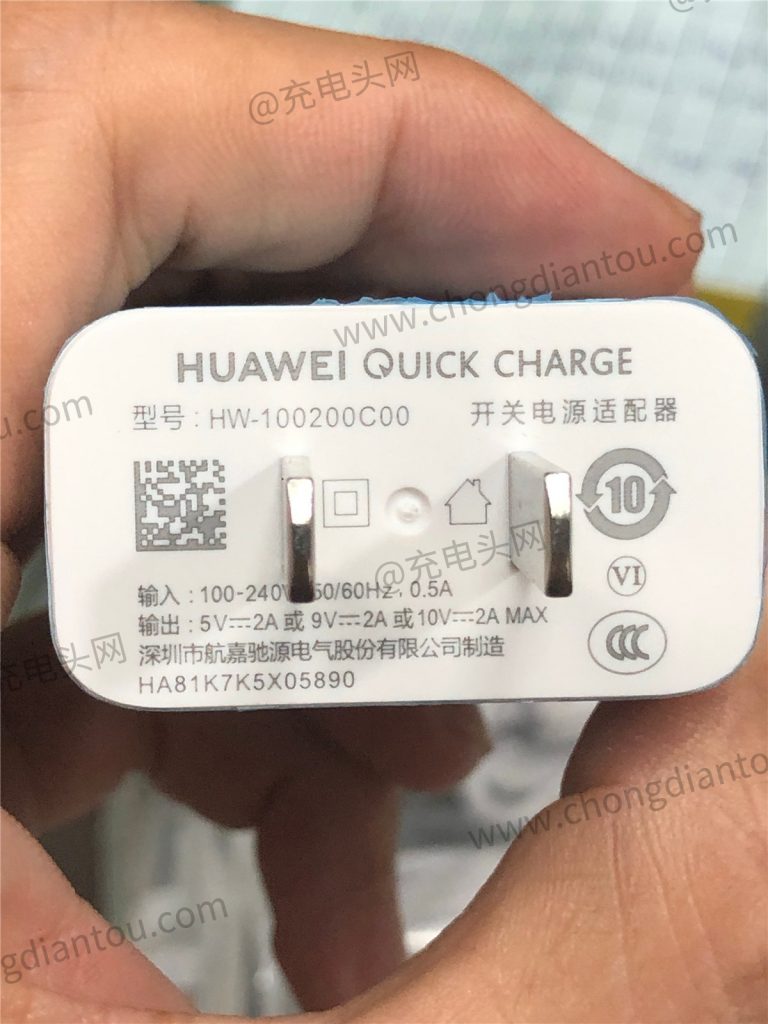 充電器插腳不可折疊。從上圖可知,這款充電器的型號為HW-100200C00,支持5V/2A、9V/2A、10V/2A三檔輸出,最大功率20W,由深圳市航嘉馳源電氣股份有限公司制造。