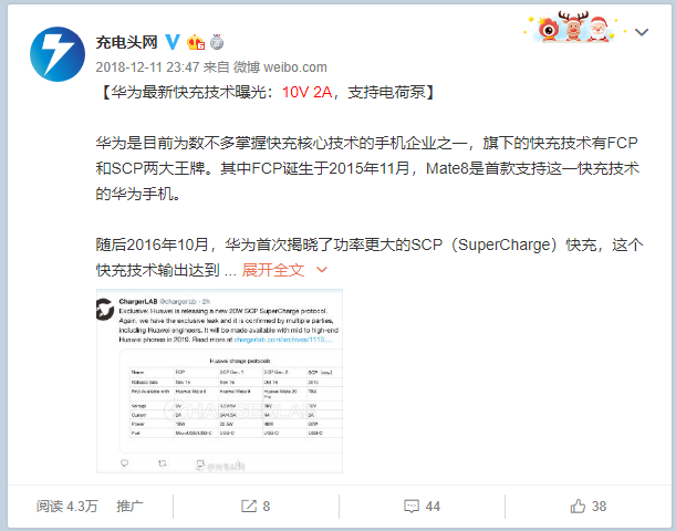 去年12月,知名充電博主充電頭網從ChargerLAB處獲悉華為最新的快充技術:10V/2A電荷泵。