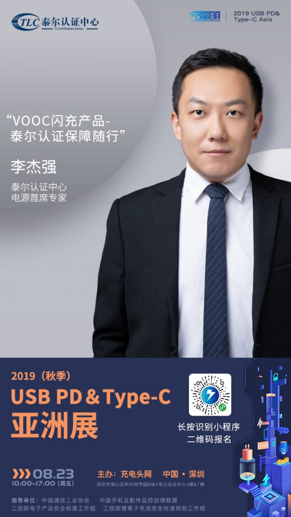 泰爾認證中心電源首席專家 李杰強確認出席2019(秋季)USB PD&Type-C 亞洲大會,并將在現場為大家帶來《VOOC閃充產品-泰爾認證保障隨行》主題演講。