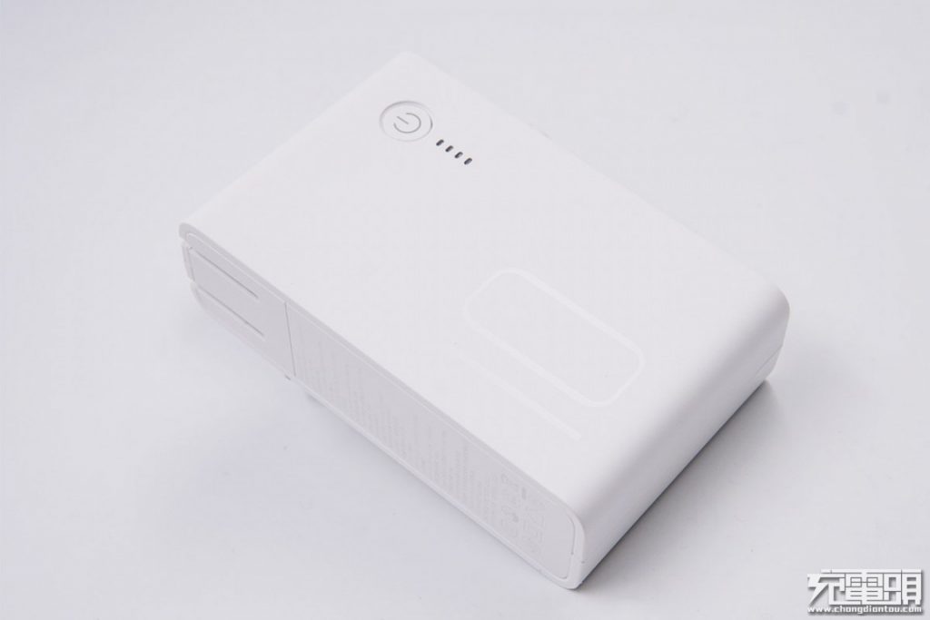 頂部帶有一個電源開關鍵,開關略微向下凹陷,可以在使用時增加觸感上的識別,旁邊是3顆藍色LED電量指示燈,以及一顆快充指示燈。