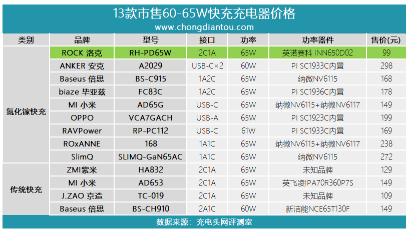 在產(chǎn)品的售價(jià)方面,充電頭網(wǎng)統(tǒng)計(jì)包括ANKER、RVAPOWER、倍思、畢亞茲、小米、OPPO、SlimQ等品牌在內(nèi)的8款60-65W氮化鎵快充充電器,以及紫米、小米、京造、倍思等品牌的65W級(jí)三口傳統(tǒng)快充充電器。