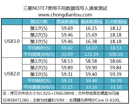 同樣對1.92G的文件進行拷貝,為減小誤差,每條數據線測試3次,且電腦端分別使用USB2.0、USB3.0接口,測的數據如下: