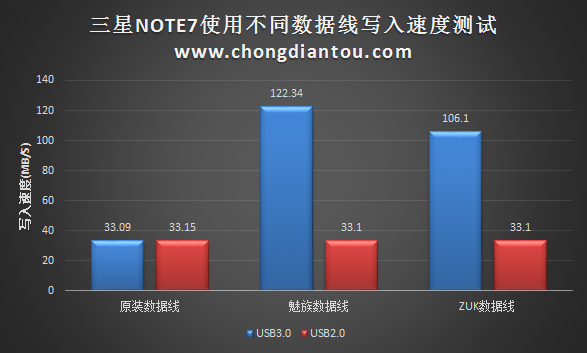 使用USB3.0接口,魅族數據線和ZUK數據線均超過100MB/S,一部2G電影20S不到,達到USB3.0標準,魅族線毫無意外排在第一。使用USB2.0接口時,三條數據線傳輸速度相差無幾,均維持在33MB/S左右,原裝數據線相比略有優勢,總耗時約為USB3.0的4倍。